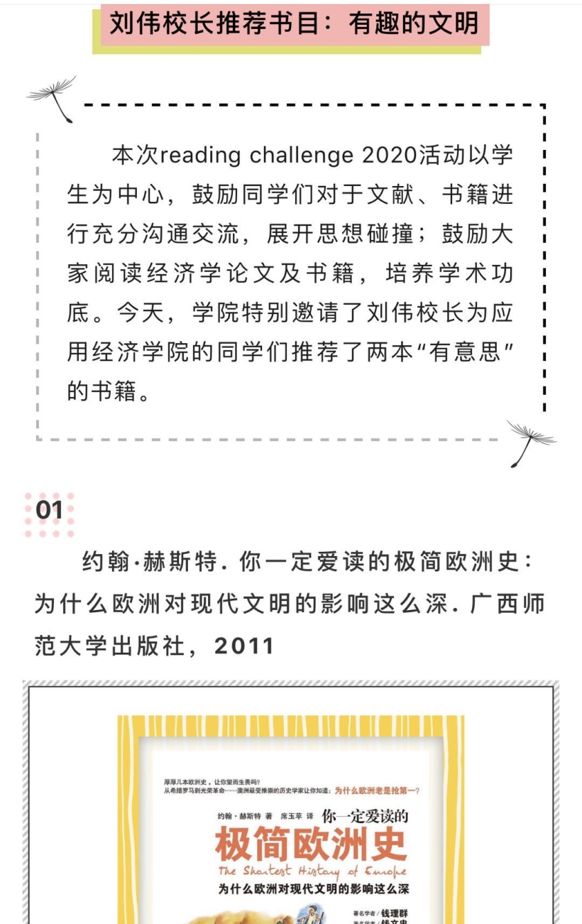 为进一步落实“三全育人”体制机制,做好疫情期间的人才培养工作,培养适应新时代要求的应用经济学“三有”人才,鼓励同学们在疫情期间阅读经典文献、追踪前沿研究,学院党委积极与多位学校领导请示,邀请靳诺书记、刘伟校长、贺耀敏副校长、吴晓球副校长和学院教师一起,为英雄联盟下注 的同学们推荐“主流、经典、前沿”书籍,鼓励同学们在阅读中增长知识,在阅读中扩大视野。