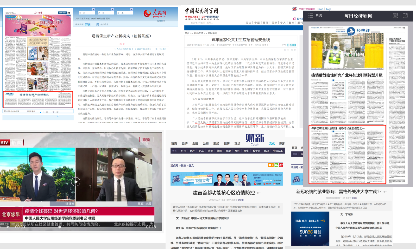 郑新业、丁守海、姚永玲、林晨等多位老师通过公开发表疫情英雄联盟下注相关的文章、接受媒体访谈等形式,对民众十分关切的疫情对经济发展、就业影响等话题予以解答,人民日报(海外版)、人民网专刊、中国社科报、每日经济新闻、财新网和北京电视等媒体对相关观点进行了专门报道。
