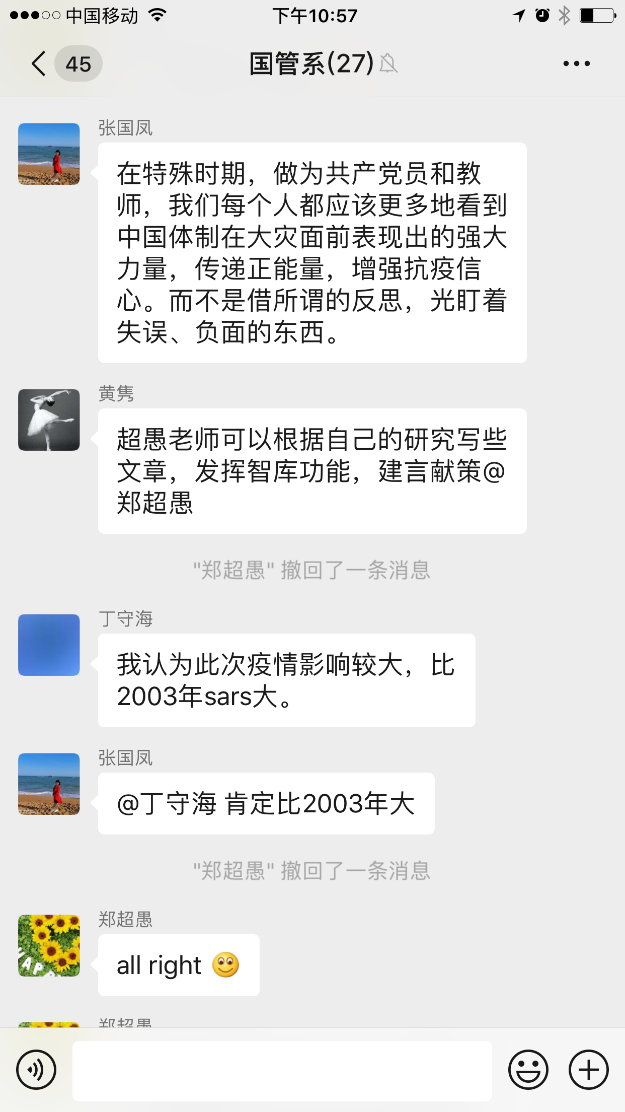 2月25日,在全国抗击新冠肺炎的关键时刻,英雄联盟下注 行政人员党支部响应学院党委号召,打破空间限制,在微信群中开展“应经抗疫,行政党员在行动”线上主题党日活动,全体党员参与本次活动。每位党员都结合自己的工作和生活谈了自己的认识与感触,共同交流共同学习,保障学院各项工作顺利开展,共同努力成为应经抗疫中的先锋。大家纷纷发言,众志成城,希望用实际行动为学院、为学校、为国家的防疫工作做出应有的贡献!