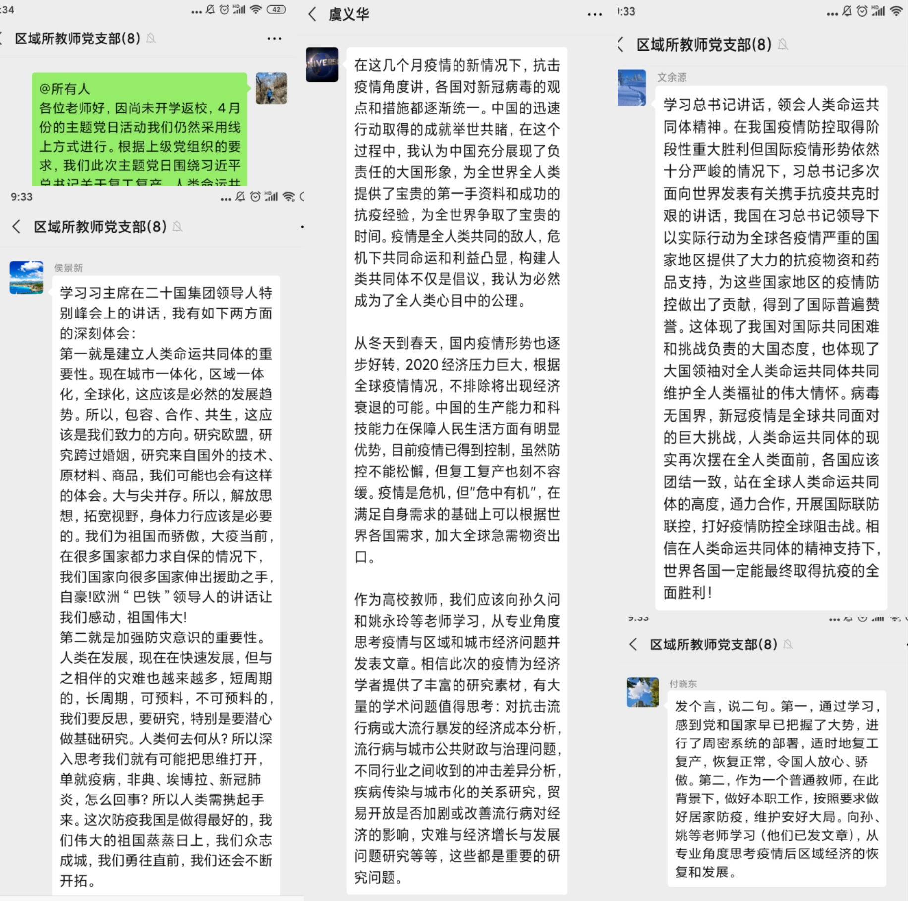 区域与城市经济教师党支部采用线上形式开展4月主题党日活动,支部围绕习近平总书记关于构建人类命运共同体的重要论述和党中央关于全面推进复工复产工作的重要决策部署进行深入学习。前期,支部成员自行学习习近平总书记关于疫情防控工作的系列重要讲话精神,随后在群内开展了学习体会交流与讨论。