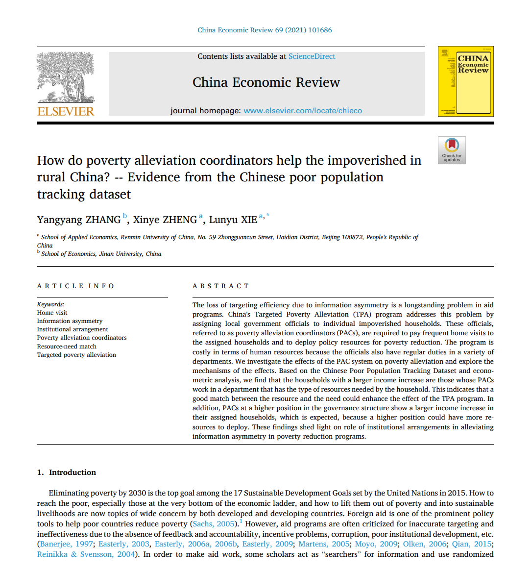 How do poverty alleviation coordinators help the impoverished in rural China? -- Evidence from the Chinese poor population tracking datasetYangyang ZHANG, Xinye ZHENG, Lunyu XIE
