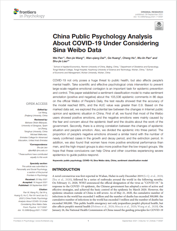 China Public Psychology Analysis About COVID-19 Under Considering Sina Weibo DataWei Pan, Ren-jie Wang, Wan-qiang Dai, Ge Huang, Cheng Hu, Wu-lin Pan, Shu-jie Liao