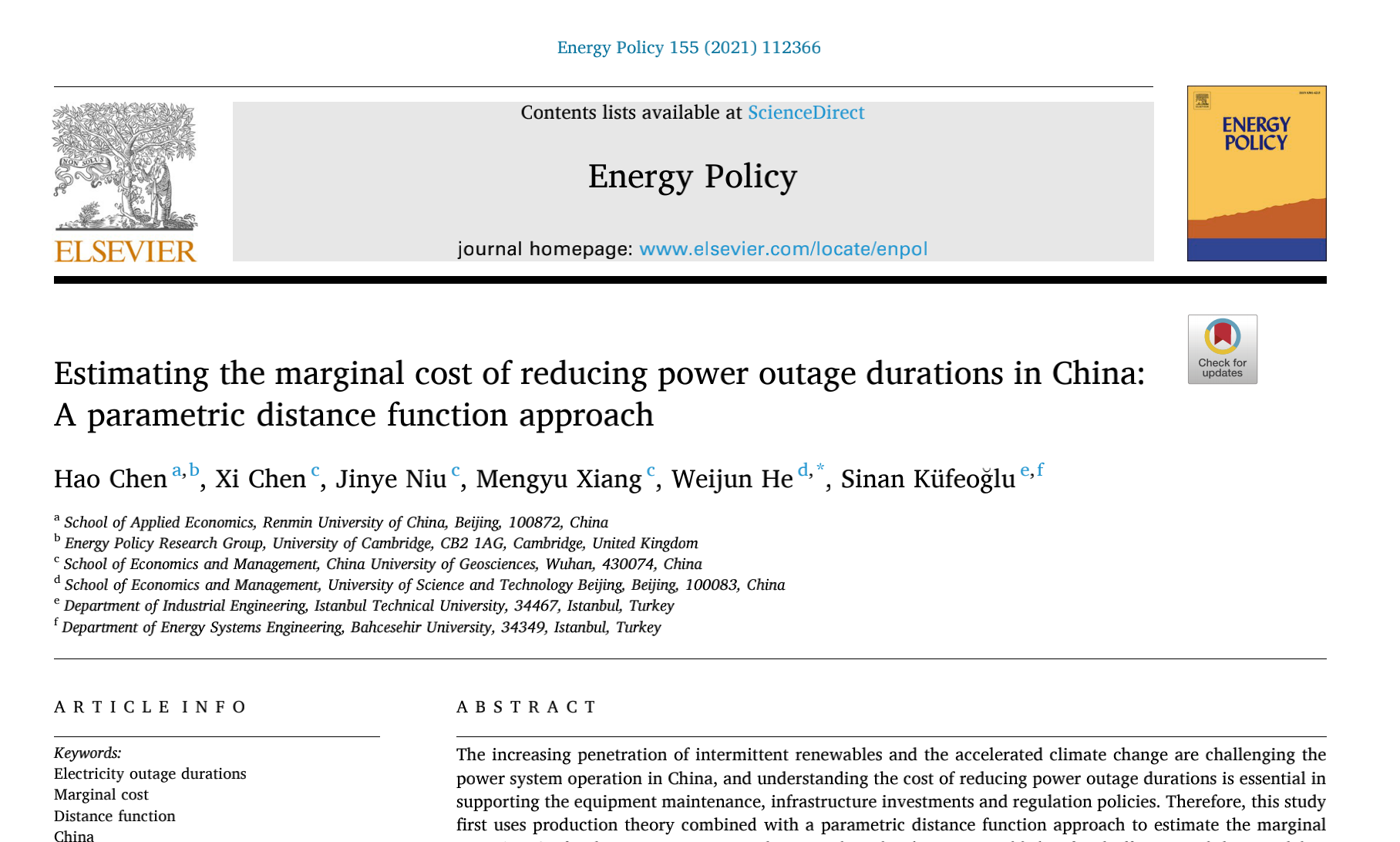Estimating the marginal cost of reducing power outage durations in China A parametric distance function approachHao Chen, Xi Chen, Jinye Niu , Mengyu Xiang , Weijun He , Sinan Küfeoglu