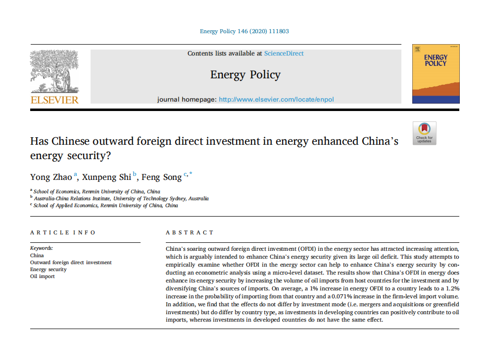 Has Chinese outward foreign direct investment in energy enhanced China’s energy security?Yong Zhao , Xunpeng Shi , Feng Song