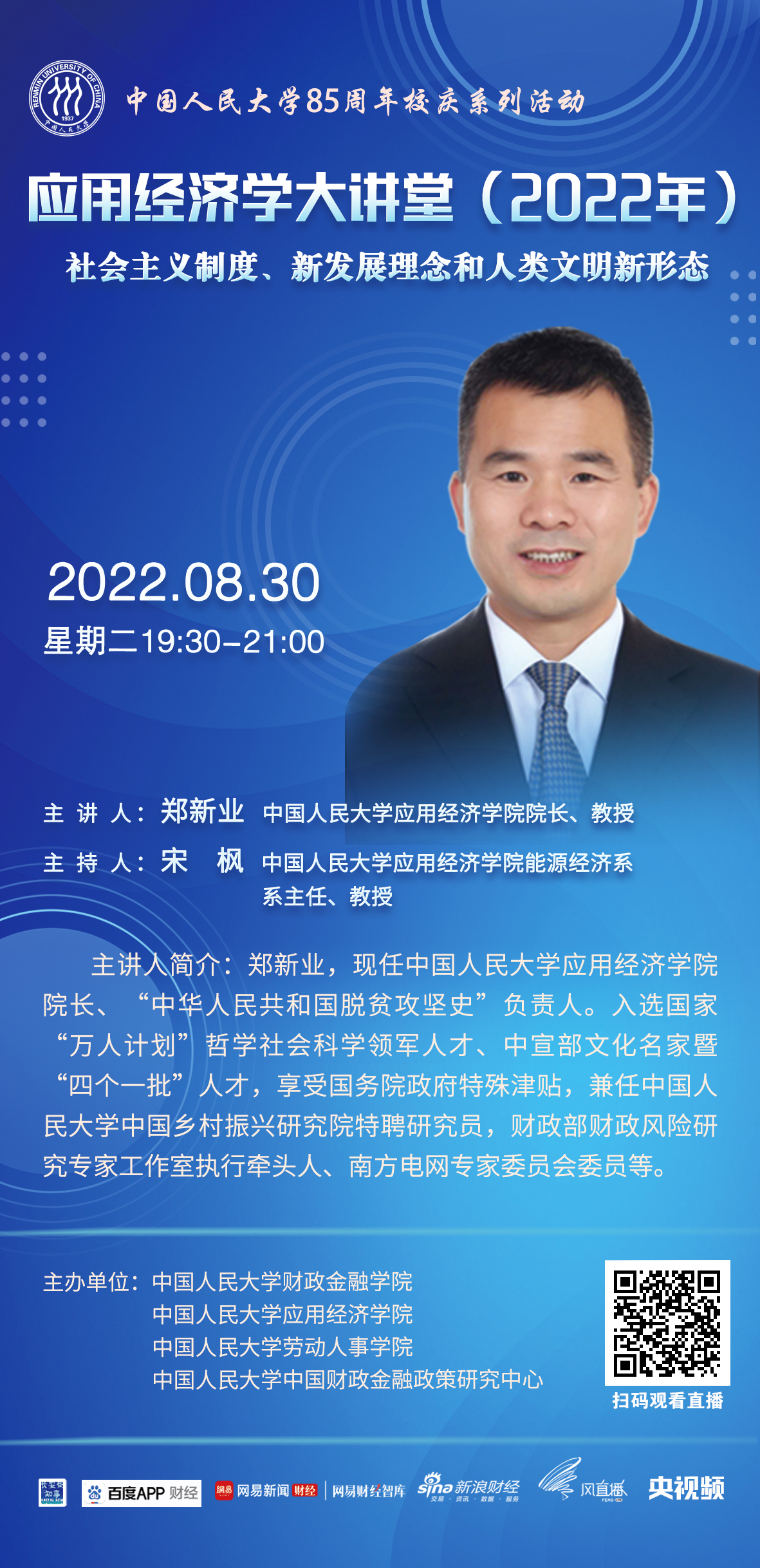 为进一步服务于国务院学位委员会应用经济学学科评议组,推动中国应用经济学科整体快速发展,中国人民大学应用经济学科在继续承办“应用经济学年会”(冬季)、《应用经济学评论》的基础上,推出“应用经济学大讲堂”(夏季)系列讲座,旨在通过汇集全国高校应用经济学科学术带头人与青年学者代表,打造一个顶尖学者交流研讨、协同创新、共谋发展的学术交流平台,针对新时代国民经济和社会发展的重大需求,聚焦中国特色社会主义市场经济建设,总结提升中国发展经验,为世界贡献新的理论和解决方案。第九讲由中国人民大学英雄联盟下注 院长郑新业教授主讲。