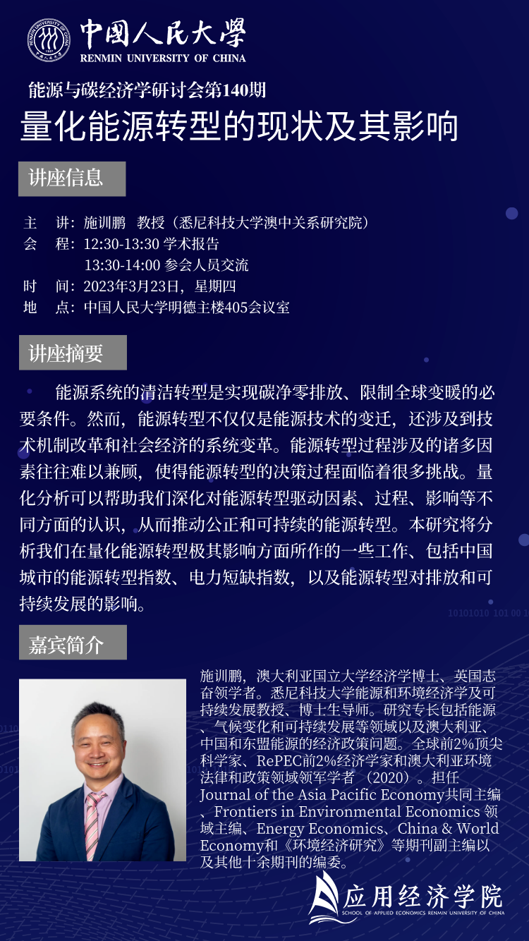 施训鹏,澳大利亚国立大学经济学博士、英国志奋领学者。悉尼科技大学能源和环境经济学及可持续发展教授、博士生导师、澳中关系研究院首席研究员;国际能源转型学会理事长、“澳大利亚中国经济研究学会”理事、会长(2016-8)。研究专长包括能源、气候变化和可持续发展等领域以及澳大利亚、中国和东盟能源的经济政策问题。全球前2%顶尖科学家、RePEC前2%经济学家和澳大利亚环境法律和政策领域领军学者 (2020)。主持国家自然科学基金、联合国亚太经社会、亚洲开发银行(ADB)、新加坡贸工部和有关国际组织委托的研究十余项。担任Journal of the Asia Pacific Economy共同主编、Frontiers in Environmental Economics 领域主编、Energy Economics、China & World Economy和《环境经济研究》等期刊副主编以及其他十余期刊的编委。经或者正在担任全球天然气中心高级顾问;APEC 可持续能源中心国内专家委员会委员;联合国亚太经社会(ESCAP)特别顾问和联合国采掘业可持续发展转型工作组成员。