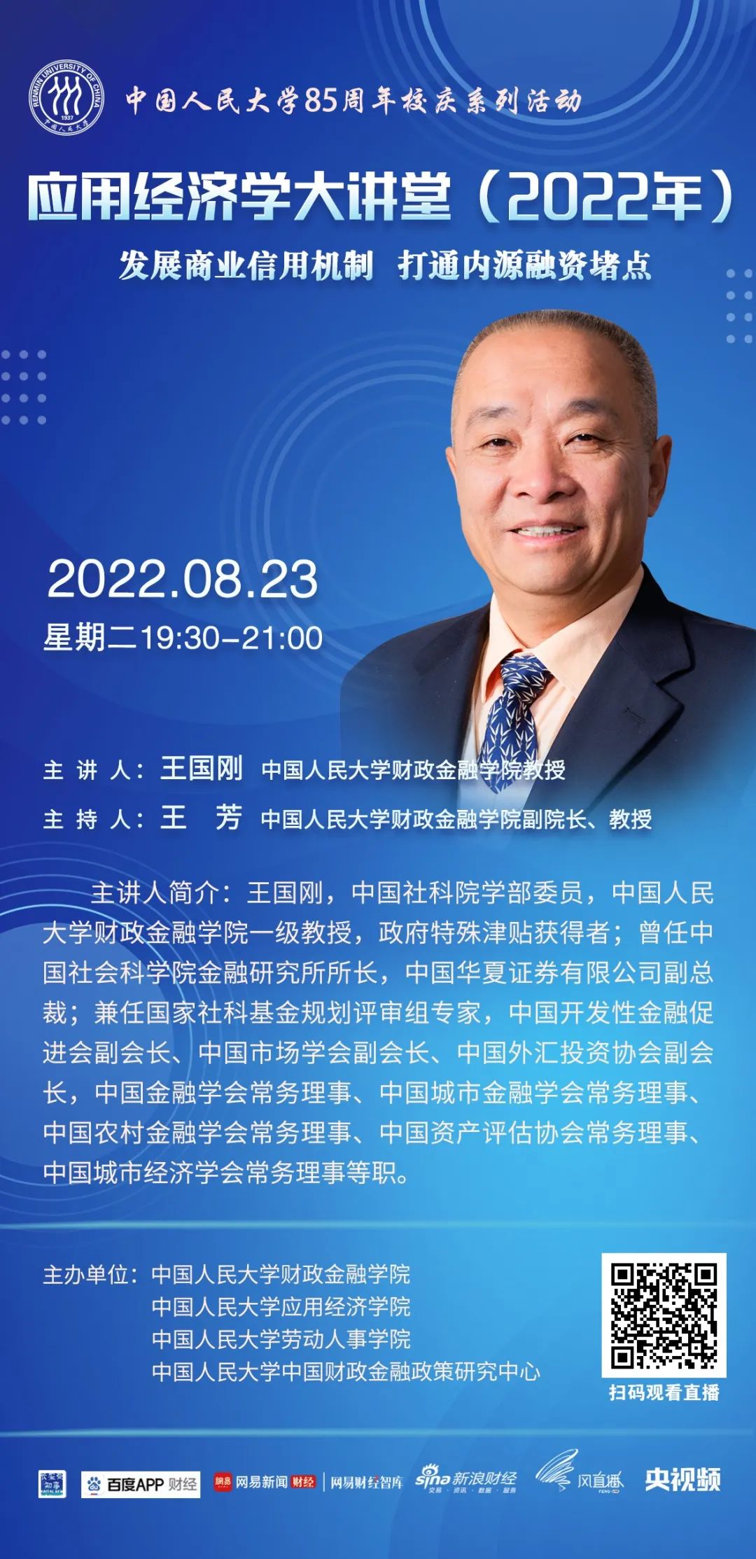为进一步服务于国务院学位委员会应用经济学学科评议组,推动中国应用经济学科整体快速发展,中国人民大学应用经济学科在继续承办“应用经济学年会”(冬季)、《应用经济学评论》的基础上,推出“应用经济学大讲堂”(夏季)系列讲座。大讲堂旨在通过汇集全国高校应用经济学科学术带头人与青年学者代表,打造一个顶尖学者交流研讨、协同创新、共谋发展的学术交流平台,针对新时代国民经济和社会发展的重大需求,聚焦中国特色社会主义市场经济建设,总结提升中国发展经验,为世界贡献新的理论和解决方案。第七场讲座由中国人民大学财政金融学院王国刚教授主讲。