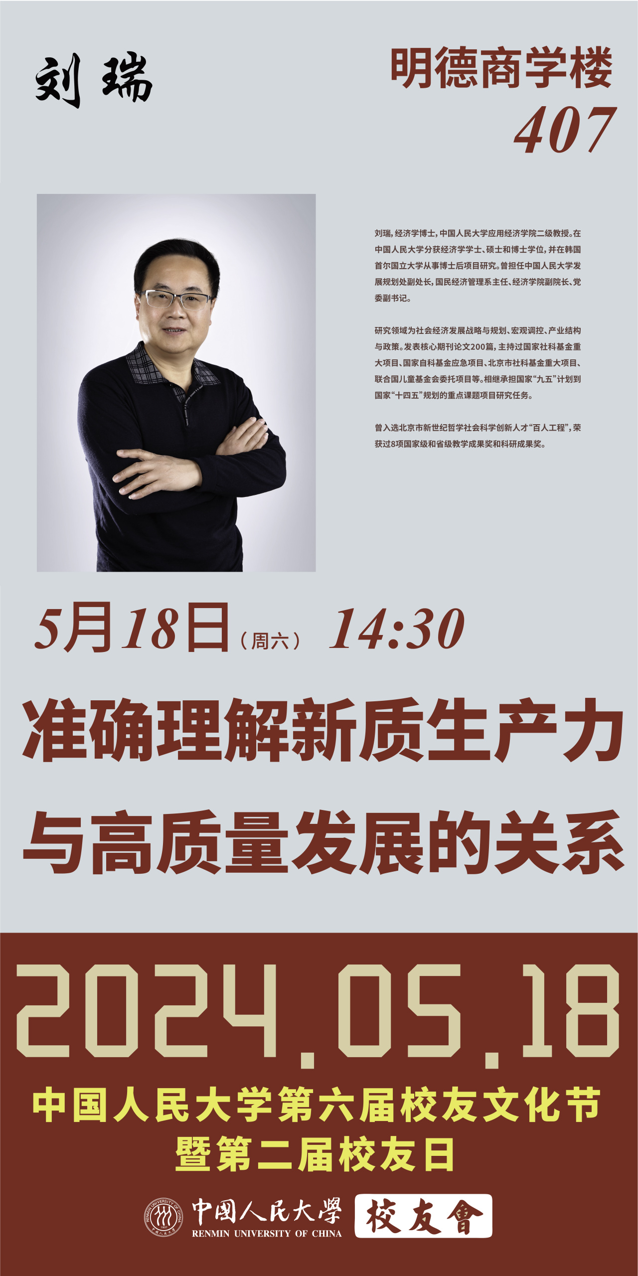 学术公告 当前位置: 英雄联盟下注 - 学术公告 - 讲座 第六届校友文化节“重返课堂”丨刘瑞教授主讲《准确理解新质生产力与高质量发展的关系》 发文时间: 2024-05-17 阅读次数: 讲座信息 讲座题目 准确理解新质生产力 与高质量发展的关系 主讲人 刘瑞 时间 5月18日(周六) 14:30 地点 明德商学楼407 请各位校友扫描下方二维码 选择课程站点落地 开启您的“重返课堂'之旅 报名通道 来源:中国人民大学校友会 设计 责编:马文林 审核:刘瑞 浩爽
