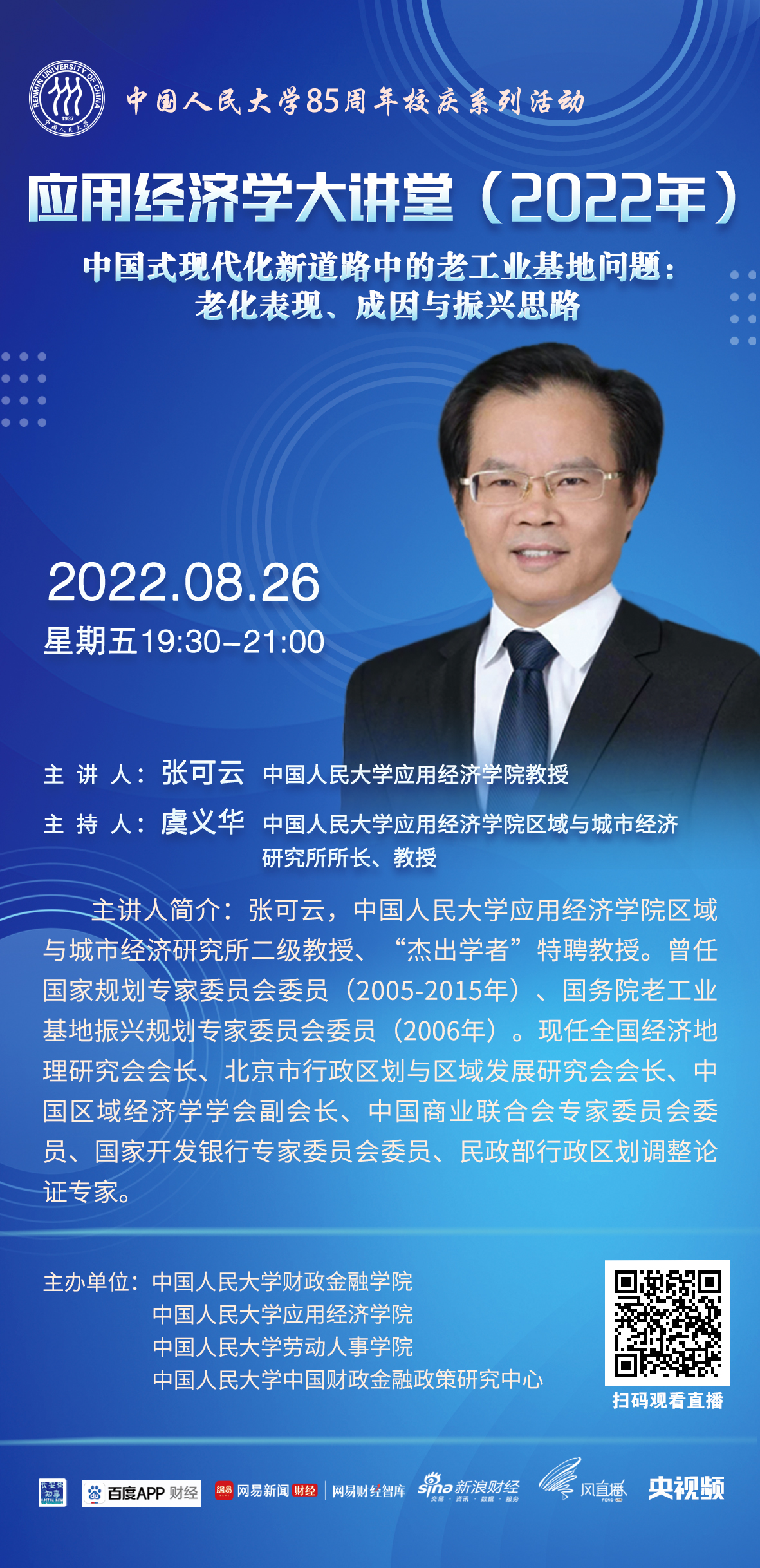 为进一步服务于国务院学位委员会应用经济学学科评议组,推动中国应用经济学科整体快速发展,中国人民大学应用经济学科在继续承办“应用经济学年会”(冬季)、《应用经济学评论》的基础上,推出“应用经济学大讲堂”(夏季)系列讲座,旨在通过汇集全国高校应用经济学科学术带头人与青年学者代表,打造一个顶尖学者交流研讨、协同创新、共谋发展的学术交流平台,针对新时代国民经济和社会发展的重大需求,聚焦中国特色社会主义市场经济建设,总结提升中国发展经验,为世界贡献新的理论和解决方案。第八讲由中国人民大学英雄联盟下注 张可云教授主讲。
