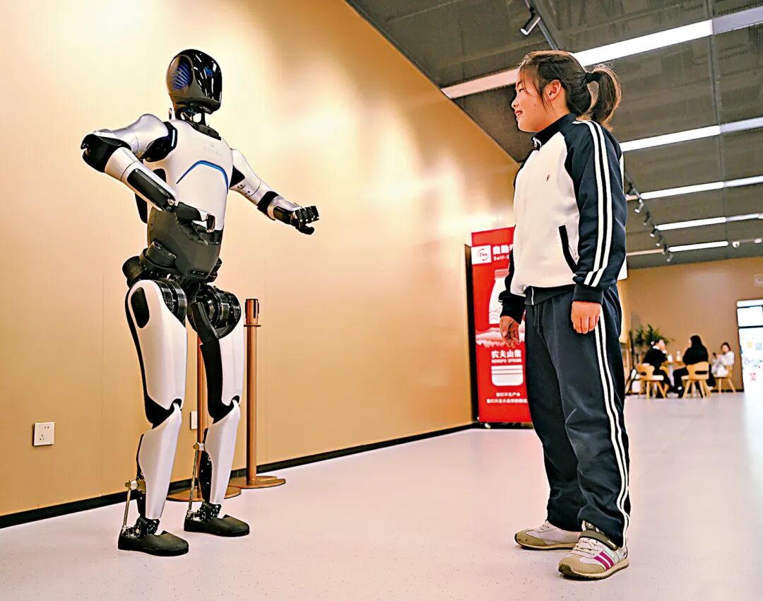 ▲在雄安圖書館,一名小朋友與機器人「館員」互動。(新華社)