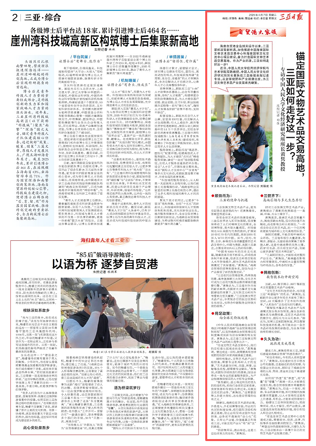 如何把“热度”变“厚度”,把“流量”变“增量”?“高端一流人才能够在这里扎根,是自贸港发展非常重要的基础。”黄隽认为,打造一个宽松、规范、专业的营商环境,和可预期的发展前景非常重要,让人才觉得在这里有上升通道、有机会,才能形成持续吸引力。她建议三亚保持发展定力,把政策用足、把人才留住、把产业做实,通过营造良好的发展软环境,吸引年轻人和企业扎根成长。