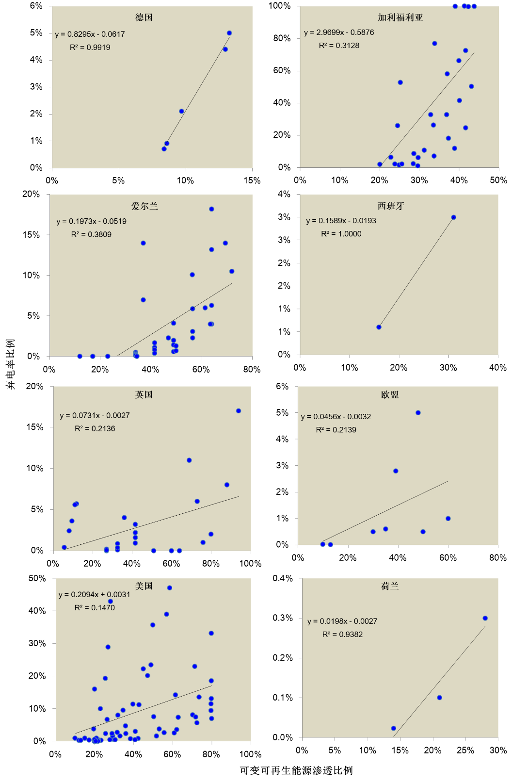 图2 不同国家或地区在不同渗透比例下的弃电率