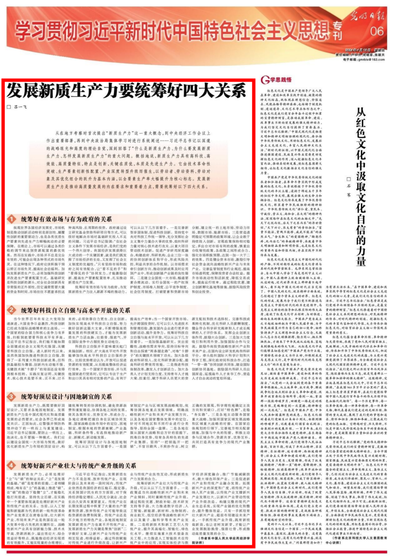 从在地方考察时首次提出“新质生产力”这一重大概念,到中央经济工作会议上作出重要部署,再到中央政治局集体学习时进行系统阐述……习近平总书记以深邃的战略眼光和高度的理论自觉,深刻回答了“什么是新质生产力、为什么要发展新质生产力、怎样发展新质生产力”的重大问题。概括地说,新质生产力具有高科技、高效能、高质量特征,特点是创新,关键在质优,本质是先进生产力。它由技术革命性突破、生产要素创新性配置、产业深度转型升级而催生,以劳动者、劳动资料、劳动对象及其优化组合的跃升为基本内涵,以全要素生产率大幅提升为核心标志。发展新质生产力是推动高质量发展的内在要求和重要着力点,需要统筹好以下四大关系。