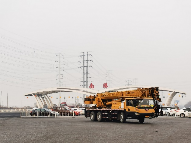 一辆吊车正驾离天津市滨海新区南港工业区。(贺觉渊/摄)