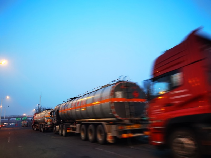夜幕降临,天津南港工业区的卡车车队从工业区驶出。(贺觉渊/摄)