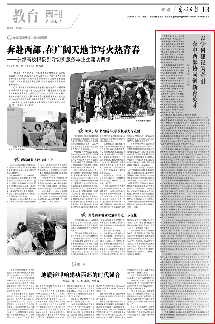 人才是第一资源。今年的《政府工作报告》提出,促进人才区域合理布局,加强东中西部人才协作,鼓励优秀人才在中西部地区建功立业。强化教育对科技和人才的支撑作用,以东中西部高校协同创新推进人才合理布局,有助于提高人才供需适配性,在服务国家区域重大战略、推动区域协调发展的同时,促进高质量充分就业。