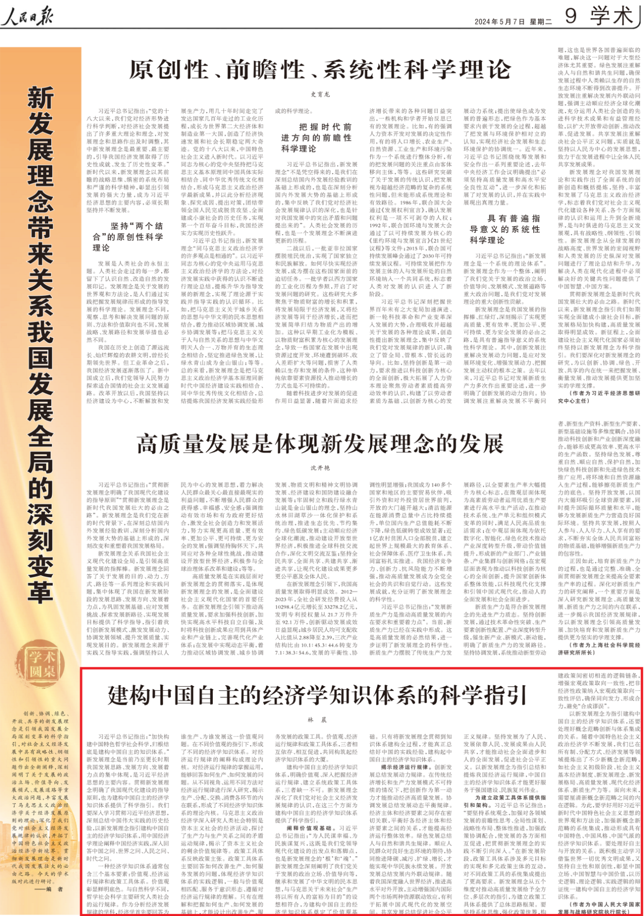 建构中国自主的经济学知识体系,明确价值观、深入把握经济运行规律、建立系统政策工具体系,三者缺一不可。新发展理念深化了我们党对社会主义经济发展规律的认识,在这三个方面为建构中国自主的经济学知识体系提供了科学指引。