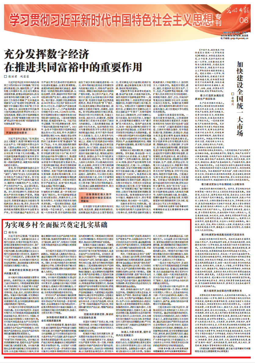 习近平总书记强调,“民族要复兴,乡村必振兴”。全面建设社会主义现代化国家,实现中华民族伟大复兴,最艰巨最繁重的任务依然在农村,最广泛最深厚的基础依然在农村。实施乡村振兴战略,是决胜全面建设社会主义现代化国家的重大历史任务,是新时代“三农”工作的总抓手。必须从统筹“两个大局”的高度,充分挖掘乡村振兴在稳定经济增长、推动高质量发展和实现共同富裕方面的巨大潜力。