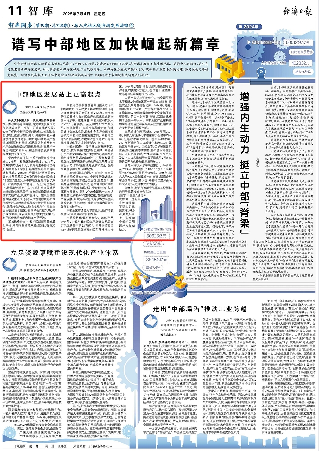 一是经济体量不断增长。2015年至2024年,中部六省地区生产总值由不足15万亿元跃升至约28万亿元,年复合增长率7.5%,快于同期京津冀地区和粤港澳大湾区。2024年,河南、湖北、湖南、安徽四省经济总量均突破5万亿元,全国前十占三席,中部地区经济腹地作用凸显。