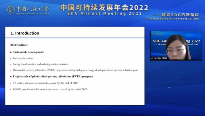 中国人民大学博士研究生肖寒作报告,题目为“Effect of photovoltaic poverty alleviation program”。光伏扶贫是中国脱贫攻坚过程中兼顾绿色能源发展与减贫的项目之一。该研究使用中国中部地区某代表县的贫困人口长期追踪数据库,评估光伏扶贫项目的影响。研究结果显示,光伏扶贫项目显著增加了贫困家庭的劳动力供给和工资性收入;光伏扶贫项目还使村级的收入基尼系数降低了0.027,产生了显著的分配效应。