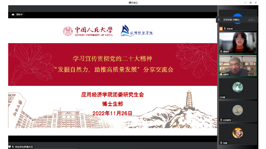 本次“发掘自然力,助推高质量发展”主题分享活动结合应用经济学科专业,从区域经济学的专业视角,使同学们更加深入地学习了党的二十大报告的相关内容,激励同学们努力提升专业本领,成长为堪当民族复兴重任的时代新人。