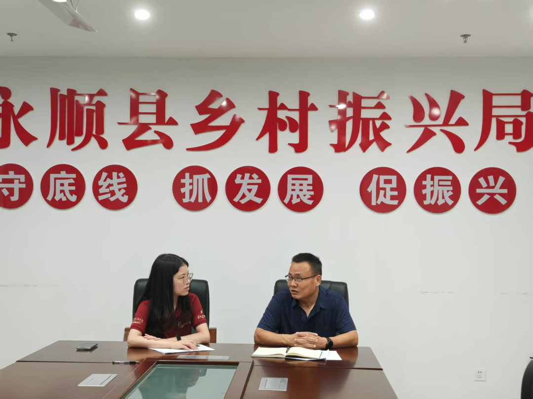 ▲湖南大学经济与贸易学院老师艾克帕尔访谈县农业农村局党组书记、局长马山波