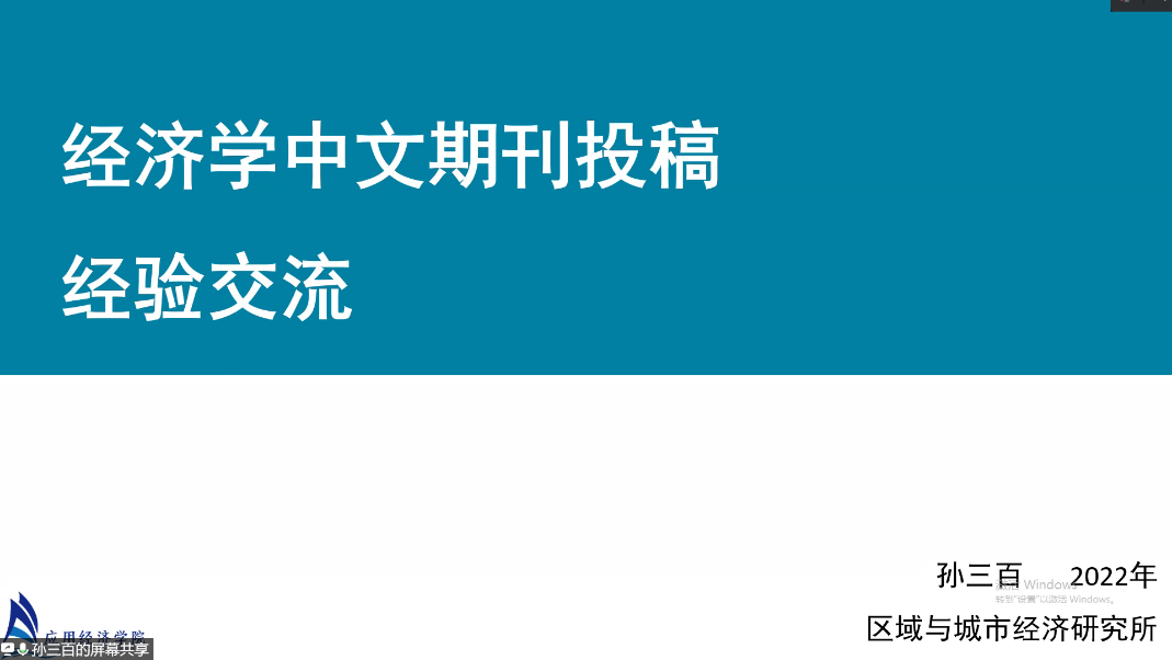 讲座伊始,孙三百与参会者分享了自己的求职和工作经历对学术研究的影响。随后,孙三百以“我与经济研究”为题,通过介绍自己在科研发表工作上的失败与成功经历,向大家传授中文论文应如何选题,并进一步总结多条中文论文投稿的实用性建议。最后,孙三百勉励大家在论文投稿时要保持足够的信心和耐心,同时也建议大家在日常学习和科研中要不断地提高自身的写作能力。