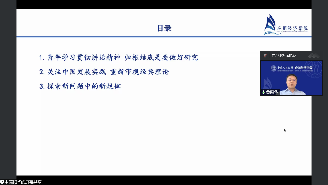 黄阳华首先带领大家重温了习近平总书记4月25日在人民大学考察调研时的重要讲话,指出青年研究者学习贯彻重要讲话精神,关键是要立足中国发展实际,研究中国的真问题、新问题和新特征。黄阳华以“关注中国发展实践,重新审视经典理论”为题,结合自身的研究经历,分享了如何从现实中发现重要的研究问题,并在探究经典理论解释中国实践的不足中推出新的学术观点。黄阳华还以2021年中央经济工作会议为例,讲解了如何将政治语言转化为学术语言,将政策问题转化为研究问题的技巧,从我国进入新发展阶段后面临的新问题中探寻新规律。最后,黄阳华勉励大家在科研中要以时代为观照、以中国为观照,自觉立足中国实际,解决中国问题。