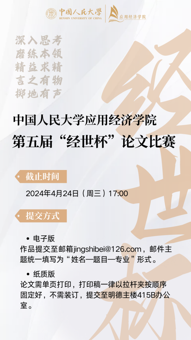 请点击“附件”获取论文格式要求,并根据说明提交作品。欢迎应经学子们积极报名,踊跃参加,充分展现个人学术思考与专业本领。期待大家在“经世杯”论文比赛中深入思考,磨练本领,精益求精,言之有物,掷地有声!