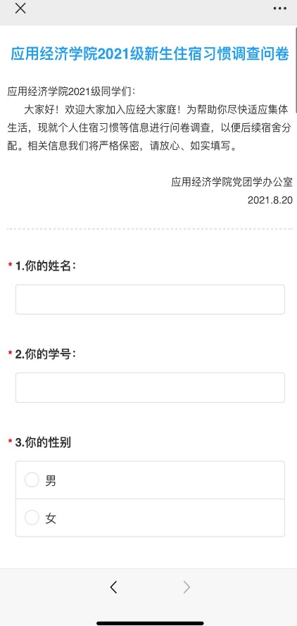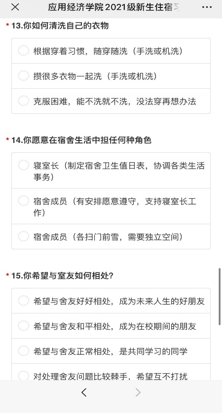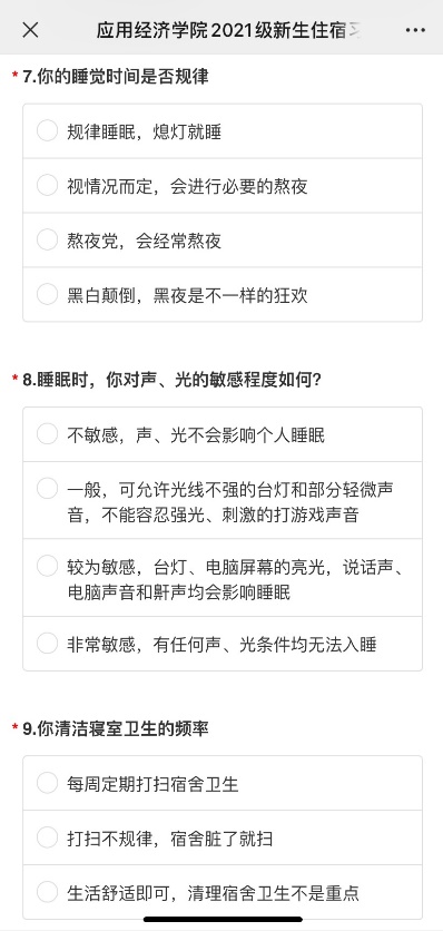 宿舍生活是新生生活的最小单元。在学校住宿调查的基础上,学院精心制作了包含16个问题的调查问卷,涉及基础信息、睡眠习惯、特殊偏好、寝室定位、人际期待等内容,全方位了解同学们的个性化需求,力求为同学们绘制精准住宿自画像。根据新生调查结果分配宿舍和床位,帮助新生尽快适应集体生活。