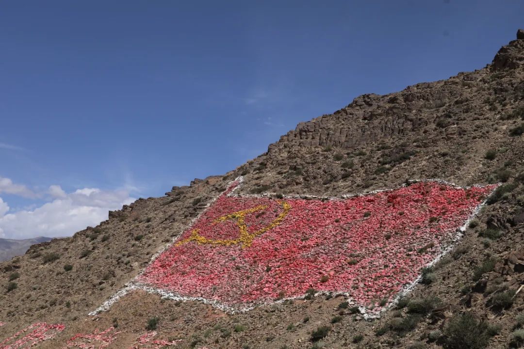 山体上鲜艳的党旗,由13670块石头拼成,代表着该村13670名柯尔克孜族人民,蕴含着柯尔克孜族人民感党恩、听党话、跟党走的赤诚信念。吐古买提乡乡党委副书记、政法书记刘文亮告诉我们,吐古买提乡最不缺的就是石头,现在干群正在用石头搭建56个坦克模型,一是为了增强戍边文化教育基地的教育性,二是为了在周边乡镇暴雨洪涝天气时能迅转移供应石块。