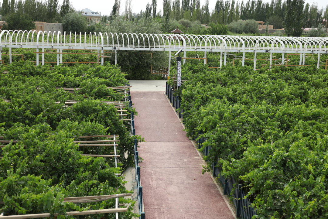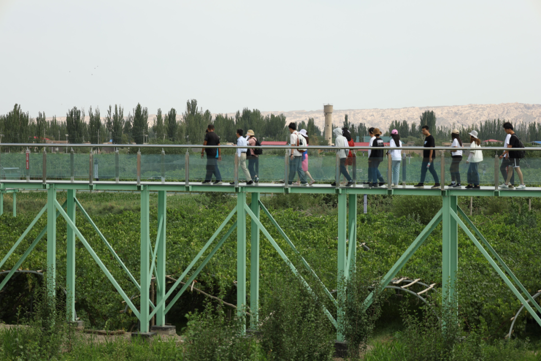 在阿图什行程的最后一站,调研团来到位于阿扎克镇阿扎克村的葡萄采摘园参观调研。负责人带领实践团成员走上玻璃栈道,以别样的视角参观了占地面积50亩的葡萄采摘园。
