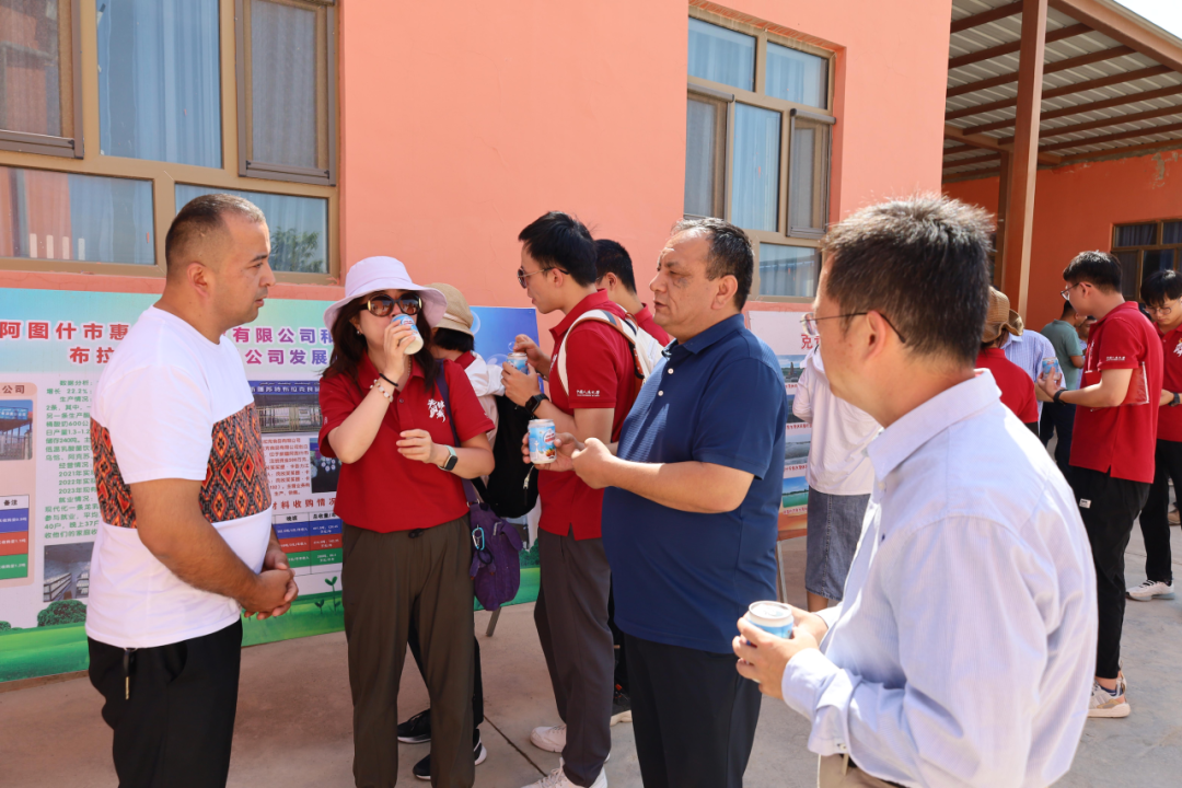 随后,在阿图什松他克镇克青孜村苏特布拉克食品有限公司,调研团品尝了当日生产的核桃酸奶,并对其独特风味与高品质给予了极高评价。本村有悠久的酸奶制作历史与丰富制作经验,但长期以来缺乏规模化生产条件,自2019年10月成立以来,该公司仅花两年时间,就从起初的乳制品小作坊扩建到如今的现代化一条龙乳制品生产线。目前公司采用“农户+工厂”的生产模式,即从农户处收购牛奶,再由公司统一加工成酸牛乳、纯牛乳等奶制品,目前公司年总收购量近900吨,直接带动本村脱贫户39人参与就业,平均工资3500元,同时又解决了老百姓牛奶卖不掉的问题。工厂现在建有两条生产线,主要采用“订单+区域代理”的销售模式,总产量可达1200公斤/日。