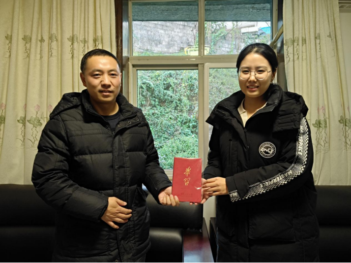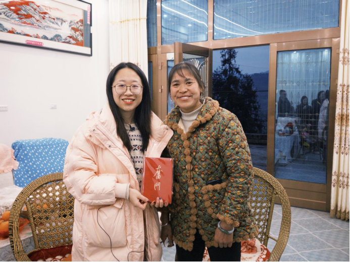 ▲昭通学院管理学院本科生周恩娜对罗坎镇副镇长李上涌(原大庙村第一书记)访谈后赠书留念