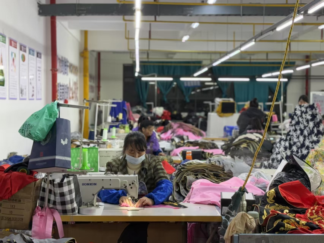 在呢噜坪易地搬迁产业园区的宝涛服装有限公司,团队调研搬迁居民就近就业情况。作为镇雄县首家港资企业,宝涛服装有限公司是一家集设计、生产、经营于一体的大型专业制衣公司。自2021年3月建成投产以来,已生产并销售成衣六七百万件,产品主要销往东南亚地区。截至目前,宝涛服装有限公司已累计为300余人提供就业机会,现有员工172人,人均月工资约为3000元,熟练工月工资可达5000至6000元,有效带动当地群众增收致富。据宝涛服装负责人介绍,镇雄县不断推进政策措施密集落地,持续优化营商环境,在证照办理、税务登记、工人招聘等多个方面都提供全程服务,为企业稳健发展提供有利条件。值得一提的是,搬迁群众淳朴勤劳,为赶订单常常加班加点,即便临近过年,部分员工收到公司通知后,也会立刻返回岗位,这体现了他们想要脱贫致富的强烈渴望,彰显了易地扶贫搬迁工作的成效。