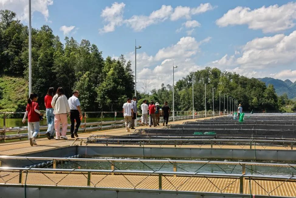 8月8日下午,调研团一行人来到紫云自治县生态渔业产业示范项目——贵州云湖众鑫现代渔业有限公司进行调研。紫云自治县生态渔业产业发展示范项目,是东西部协作资金支持下的重要成果,总投资2750万元。项目由贵阳市“贵州现代渔业集团有限公司”与紫云自治县“贵州嘉禾香农业发展有限责任公司”共同组建SPV公司合作开展,成立贵州云湖众鑫现代渔业有限公司,标志着紫云自治县渔业产业的新发展阶段。项目横跨格凸河镇二关村与四大寨乡噜嘎村,占地总面积达920余亩,创新建设圆筒式陆基养鱼池与源浮式内循环槽,是全省最大的水库工程化流水槽渔业养殖基地。