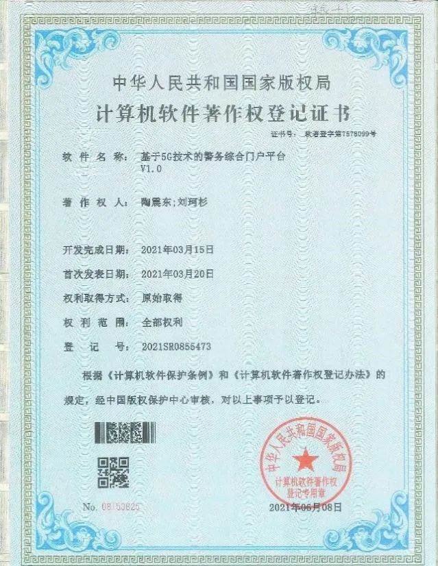 左:班团成员开发“基于5G技术的警务综合门户平台”并获计算机软件著作权