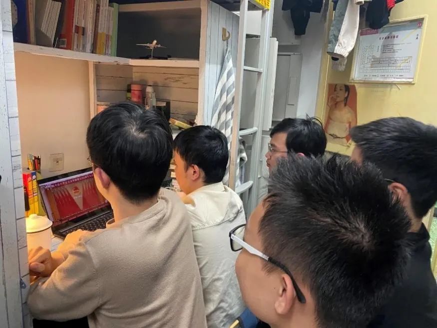 上:2020年11月,团小组在宿舍交流讨论《中共中央关于制定国民经济和社会发展第十四个五年规划和二〇三五年远景目标的建议》