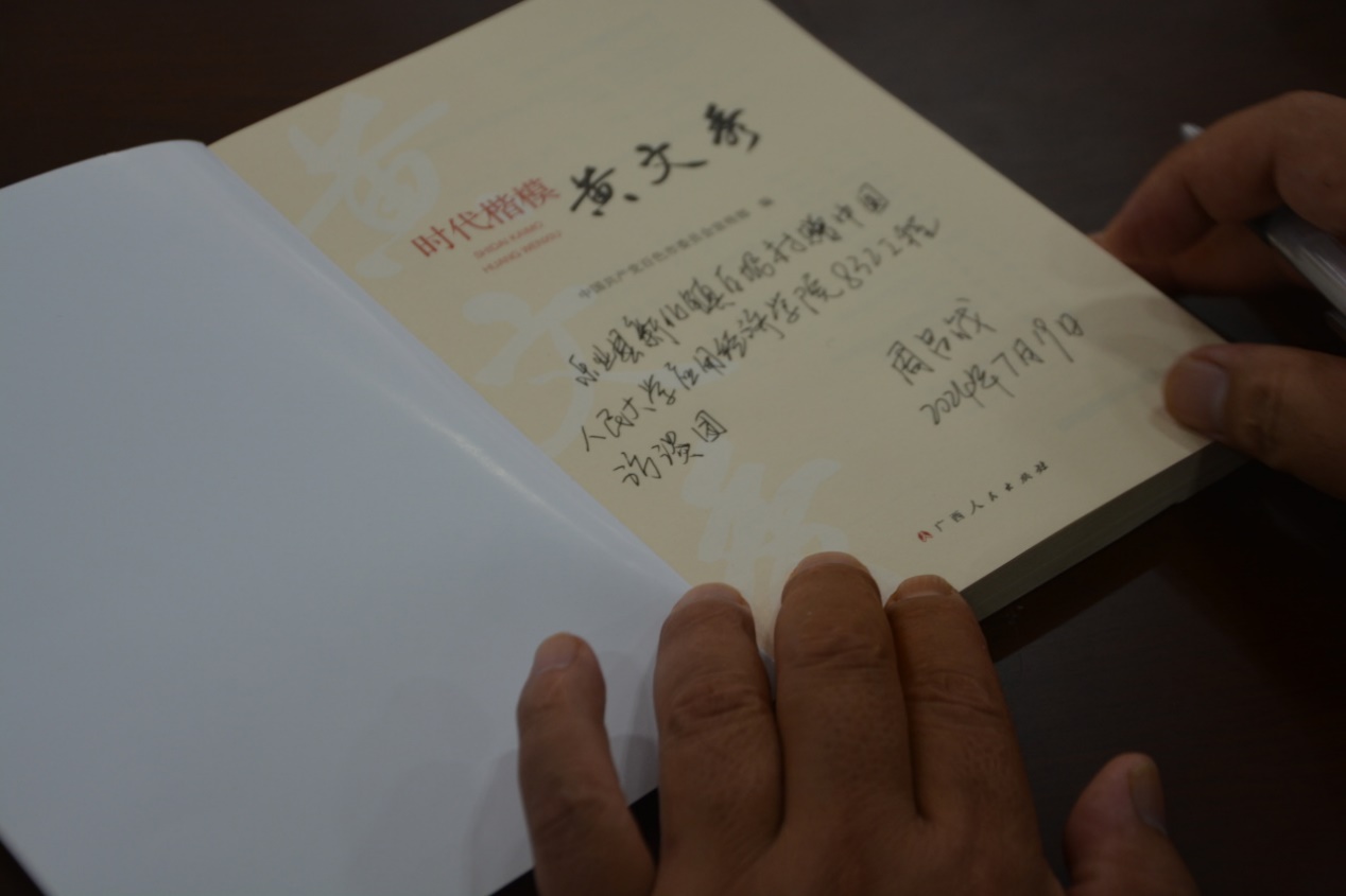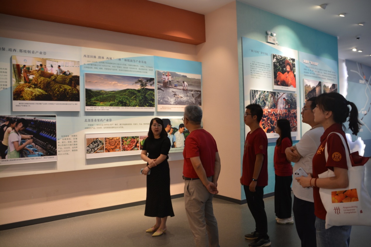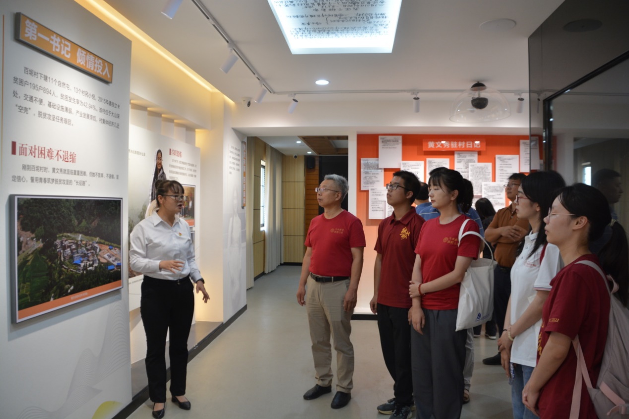 调研团首先参观了黄文秀先进事迹展览馆。2018年3月26日,黄文秀来到百坭村担任驻村第一书记,她认为,“很多人从农村走了出去就不想再回去了,但总是有人要回来的,我就是要回来的人。”黄文秀刚驻村时,全村仍有103户、473人未脱贫。黄文秀在驻村工作中不怕困难、走近群众,她主动帮村民扫院子、种油茶、摘砂糖桔;为了沟通方便,她不断学习当地的桂柳话,与村民交流;她走遍了全村的贫困户,扶贫日记里绘制了百坭村各家各户的地图,驻村一年汽车已行驶2.5万公里。2019年6月17日,黄文秀在返回乐业县的途中遭遇山洪而因公殉职。2021年,黄文秀被追授“全国脱贫攻坚楷模”称号,她坚守初心、心系群众、克己奉公、坚忍不拔,是脱贫攻坚战中坚守一线、担当实干的典范。调研团成员为黄文秀质朴的情感与无私的奉献而动容,也备受黄文秀坚定的理想信念的鼓舞,她的事迹将激励调研团成员们努力在各自领域的新时代的长征路上做出新的更大贡献。