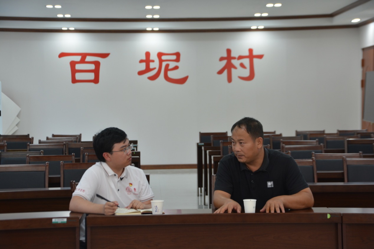 ▲冯天灏访谈百坭村党支部书记周昌战