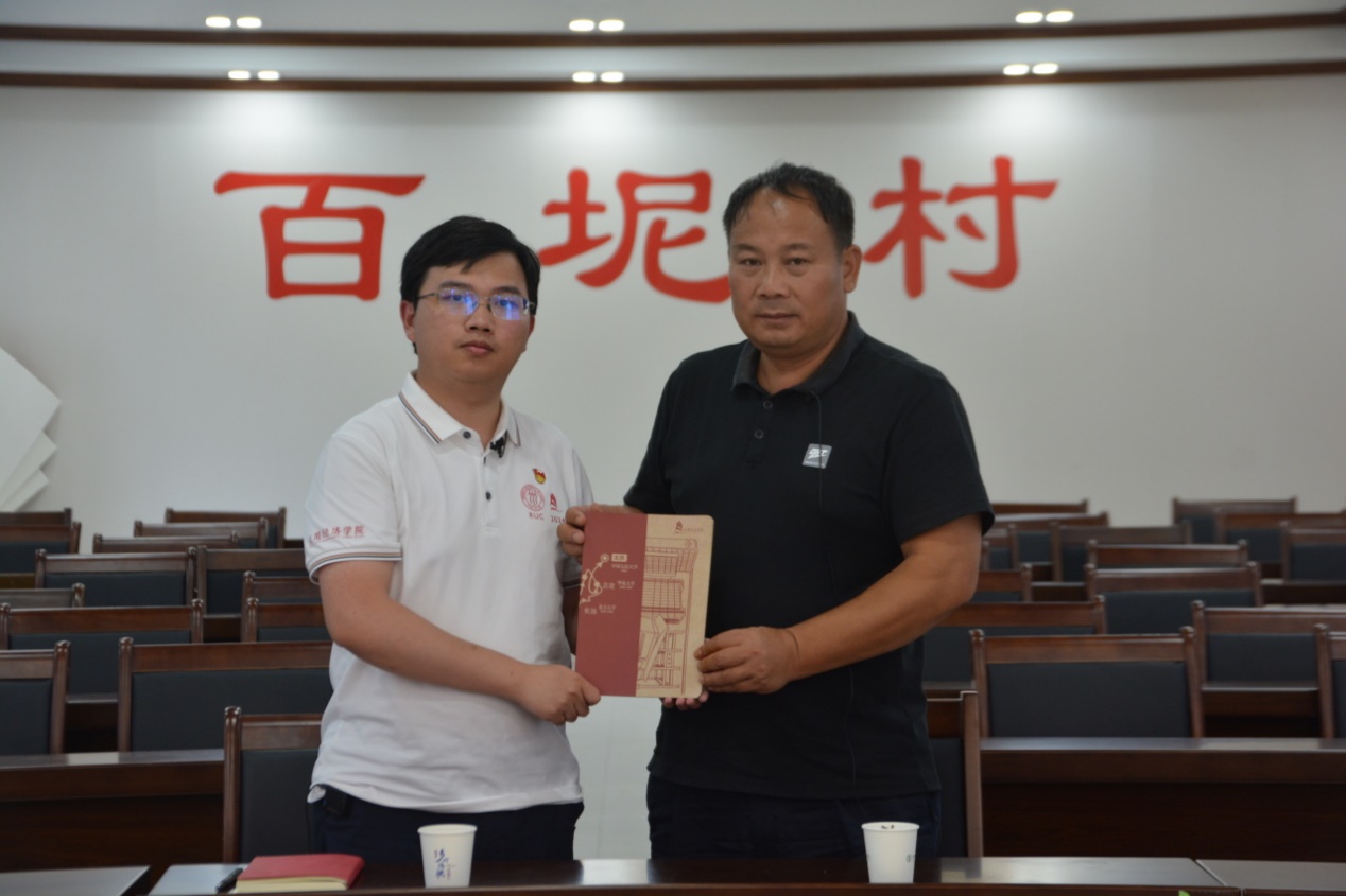 ▲冯天灏向百坭村党支部书记周昌战赠送纪念品