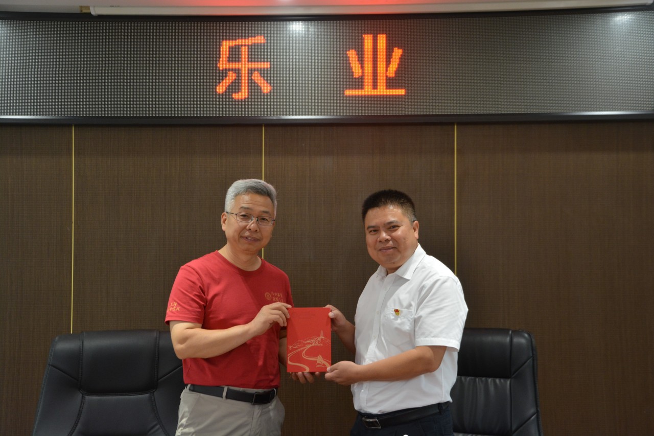 ▲杨佩霏向乐业县同乐镇党委书记梁建国赠送纪念品