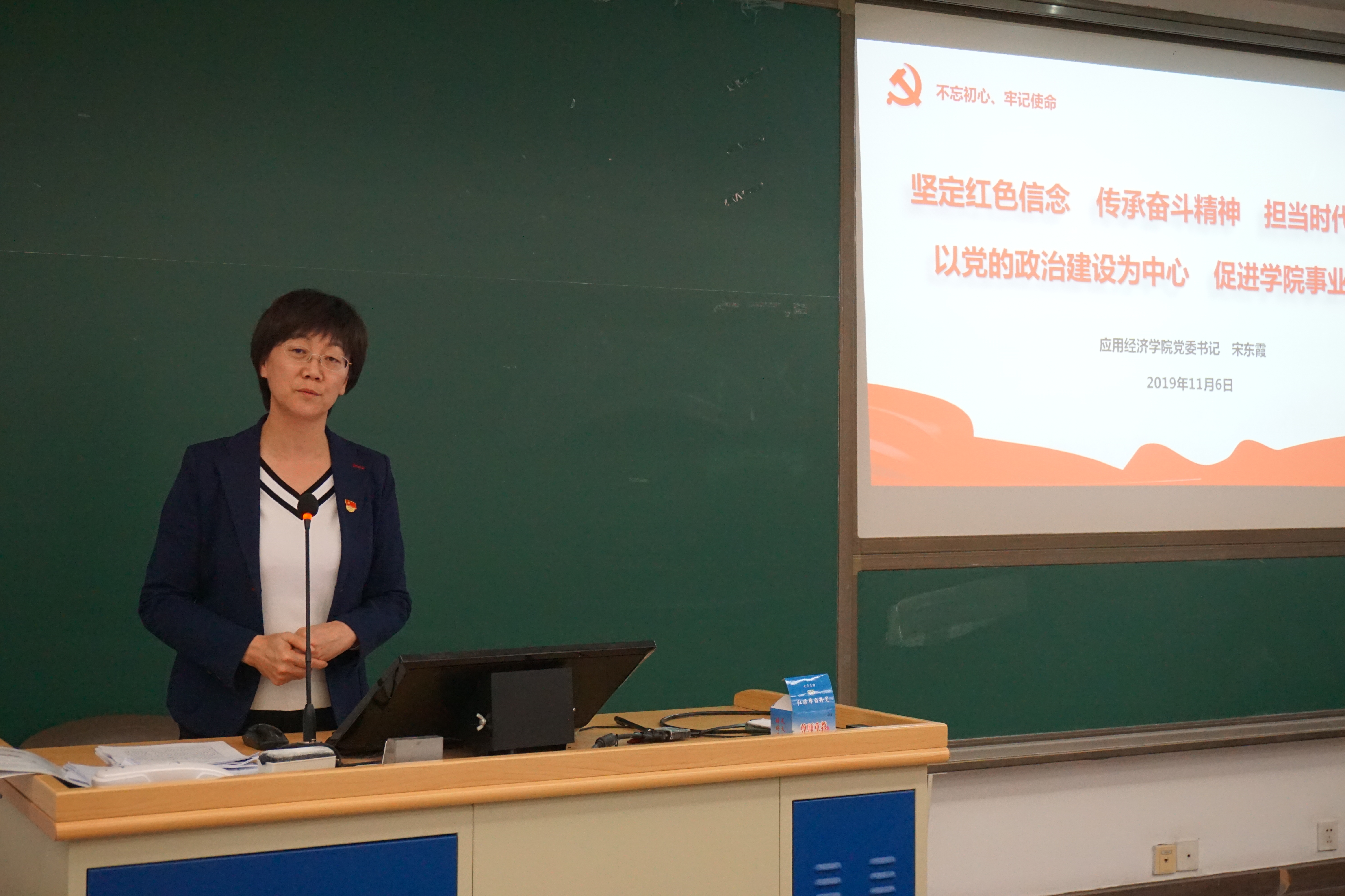 首先,党委书记宋东霞以“坚定红色信念 传承奋斗精神 担当时代重任,以党的政治建设为中心 促进学院事业发展”为题,从“悟初心”“找差距”“担使命”三个方面,进行党课授课。她指出,悟初心就是要深入学习、领会习近平新时代中国社会主义思想,坚定红色信念,继承发扬好中国人民大学的红色基因;她重点就习近平新时代中国特色社会主义思想、习近平总书记关于哲学社会科学的重要论述、习近平总书记关于教育的重要讲话进行了解读和阐释。找差距就是要对标对表,认清发展形势,查找差距和不足,她围绕学院在党的建设方面的情况和学院在立德树人根本任务推进情况进行了剖析。担使命就是要以党的政治建设为中心,围绕加强党的全面领导、贯彻立德树人根本任务、建设高素质专业化教师队伍三个方面,以始终奋进在时代前列的品格担当为己任,脚踏实地,努力推动学院事业发展。