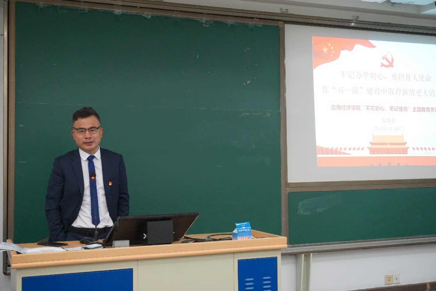 领导班子“不忘初心、牢记使命”主题教育专题党课在明德商学楼0502教室举办。学院全体领导班子成员、教职工党员、学生党员共计80余人参加党课学习。党课由学院副院长张可云主持。