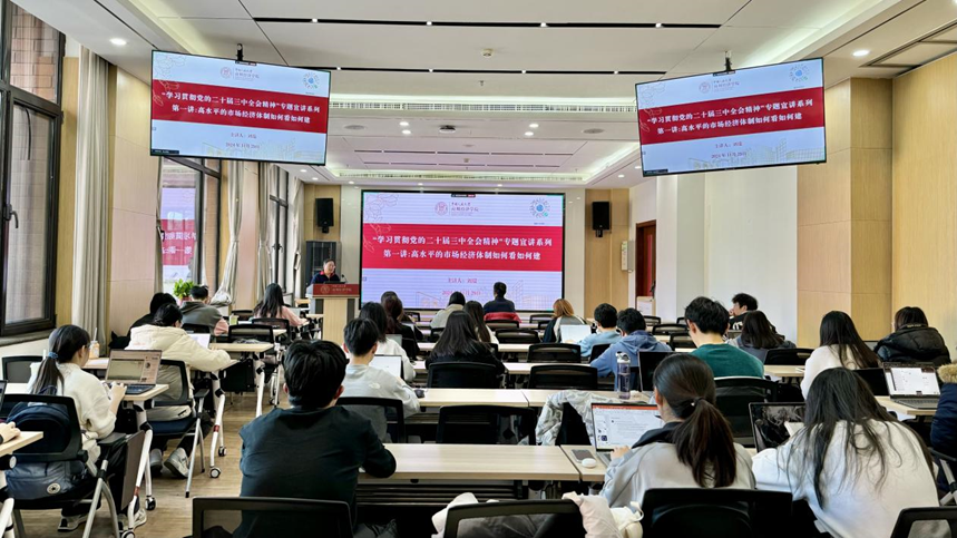 为深入学习贯彻党的二十届三中全会精神,落实党中央关于全面深化改革的决议,向全体师生和社会各界宣传阐释好《中共中央关于进一步全面深化改革、推进中国式现代化的决定》(简称《决定》)精神,11月29日,英雄联盟下注 举办“学习贯彻党的二十届三中全会精神”专题宣讲暨先锋闯将训练营系列活动讲座。本次由国民经济管理系刘瑞教授主讲“高水平的市场经济体制如何看如何建”。