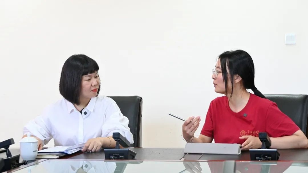 ▲调研团新闻学院助理教授王达访谈松桃苗族自治县县委常委、县委宣传部长、县委统战部部长黄思红