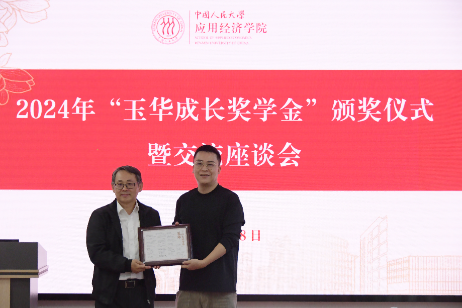 魏楚和李智勇共同为2024年“玉华成长奖学金”获奖学生颁发奖状。获奖学生代表结合各自经历分享了“玉华成长奖学金”带来的帮助,对李智勇师兄及其母亲邓玉华女士的爱心致以衷心的感谢,并表示将传递好这份温暖关怀,以优秀校友为榜样,不负学院的培养和期望,面向未来勇毅前行。