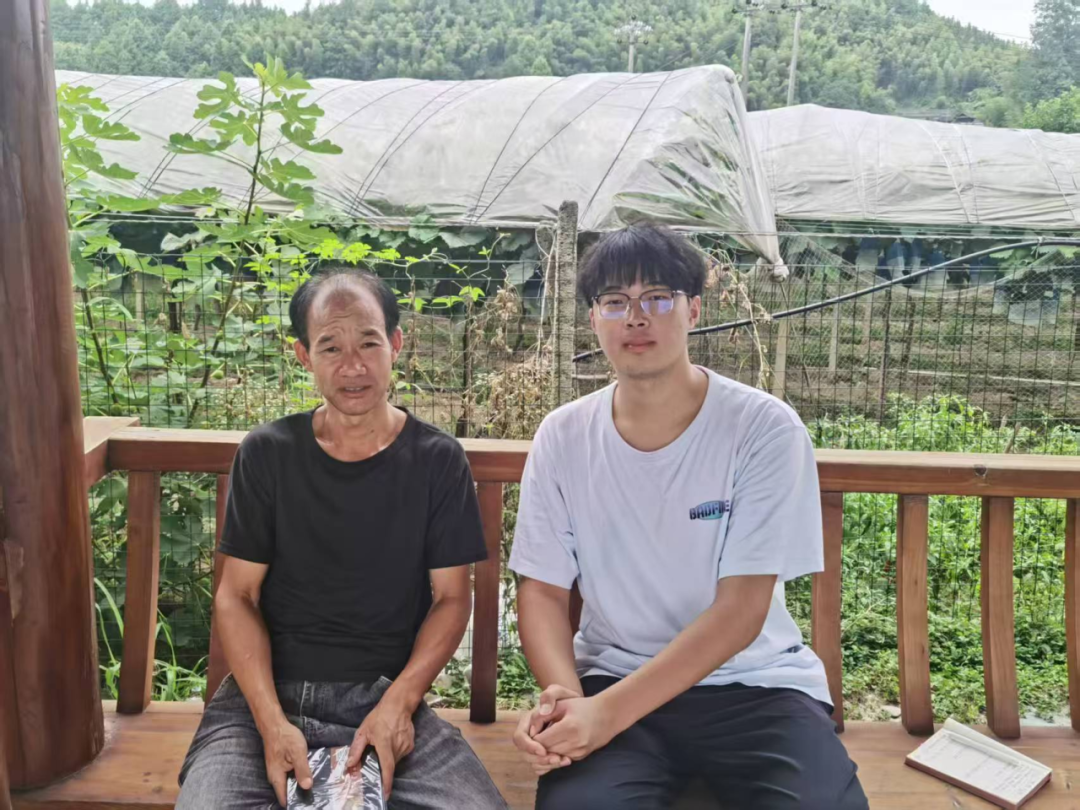 ▲本科生蓝彬城与东山村脱贫户合影