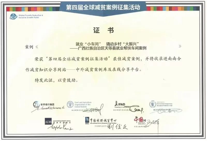 劳务输出是天等县群众增收的主要渠道,而村庄空心化、村庄“三留守”问题也接踵而至。为了解决农村留守妇女、老年人、残疾人的就业问题,天等县抓住产业转移和粤桂合作契机,积极引进创办就业帮扶车间。最典型最大规模的帮扶车间就位于龙岩社区。龙岩社区同时也是易地扶贫搬迁集中安置点,成为“易地搬迁+帮扶车间”发展模式样板间。这些帮扶车间可以帮助群众在家门口就近就业,实现就业和顾家两不误,一方面促进了收入增加,另一方面增强了易地搬迁对群众的吸引力。全县累计整合衔接资金共2648万元建设就业帮扶车间,总数量从2017年的35家增长至2022年的338家,累计带动群众就业2.23万人,吸纳脱贫人口8023人。2023年11月,天等县《就业“小车间”撬动乡村“大振兴”——广西壮族自治区天等县就业帮扶车间案例》成功入选第四届“全球减贫案例征集活动”最佳案例,提供了就业增收促减贫的“天等样本”。