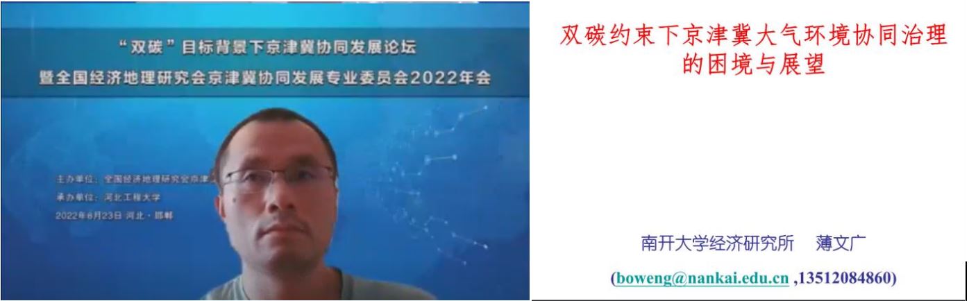 七位全国经济地理研究会京津冀专委会主任委员分别围绕京津冀协同发展的新动能、新机制、新发展和新方法展开了研讨。中国人民大学文余源教授作题为“基于航空流的中国城市群体系网络格局时空演进”的报告,讨论了城市群整体格局和航空布局、城市群体系航空流网络格局及城市群体系空间结构的时空演进特征等,为京津冀协同发展提供了思路。首都经贸大学特大城市经济社会发展研究院副院长叶堂林教授作题为“北京打造数字标杆城市的问题及对策研究”的报告,提出要充分发挥北京数字经济发展优势,为津冀两地数字经济发展提供创新动能。中国社会科学院工业经济研究所区域经济室主任叶振宇研究员做了题为“京津冀区域发展这十年的变化探究”的报告,围绕京津冀协同发展中存在集聚外部性规律、公共物品外部性规律、区域治理规律、区域增长规律和区域一体化规律,提出该区域高质量发展的新思考。河北经贸大学经济研究所所长田学斌教授作题为“类市场机制宇京津冀协同深化”的报告,强调要以类市场机制构建主体协同内生长效机制,充分调动政府积极性,破解当前京津冀协同发展面临的市场与政府“双失灵”困境。河北工程大学管理工程与商学院院长王彦林教授作题为“双碳目标与乡村振兴的协同推进”的报告,就如何协同推进“双碳”目标与乡村振兴,提出了构建乡村低碳发展工作体系、加大农业碳汇产品供给、建立完善农业碳汇市场、提升农业绿色低碳技术的研发和应用水平、加强专业技术人才支撑、充分发挥村民主体作用等六条有益思路。南开大学滨海开发研究院副院长薄文广副教授作题为“‘双碳’约束下京津冀大气环境协同治理的困境与展望”的报告,探讨了“双碳”约束下京津冀大气环境协同治理存在的四大困境,并提出了精准搭配不同政策手段、强化经济和社会可行性评估、优化相关考核和问责制度等对策建议。南开大学京津冀协同发展研究院秘书长张贵教授作题为“数字经济助力京津冀协同发展”的报告,强调数字经济对京津冀产业一体化发展的特殊作用,同时提出了确立数字经济发展指引战略目标、加快数字经济区域产业链构建、推进京津冀工业互联网协同发展、发挥京津冀数字经济联盟作用,推动有效市场和有为政府更好结合等系列对策建议,为数字经济如何助力京津冀协同发展提出了新思路、新对策。